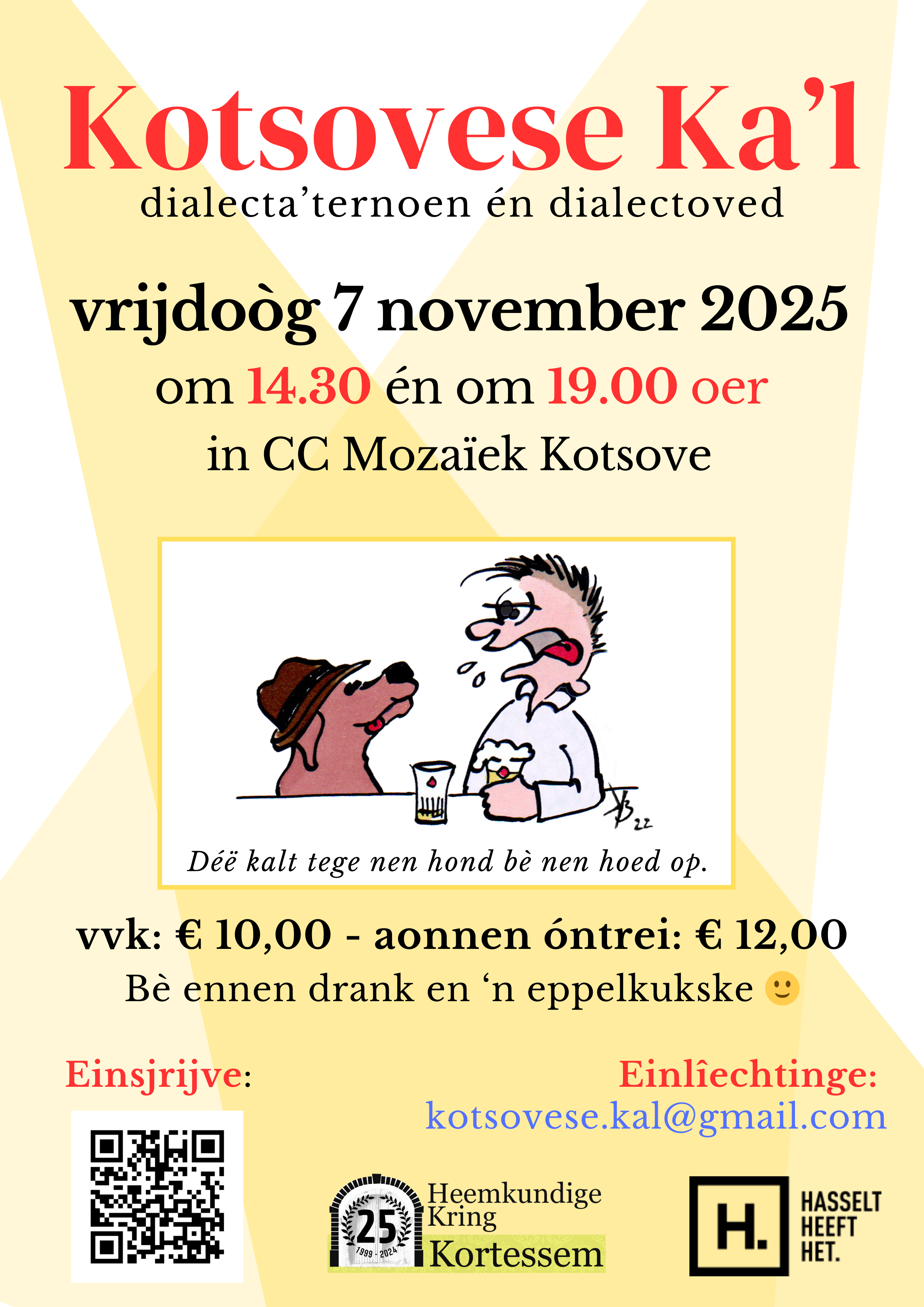 Dialectavond met verhalen, gedichten en liedjes.Aan ingang graag gepast geld. Boe CC MOZAIEK Kotshove weenij vrijdag, 7 november 2025 - 20:11 Vervilt op za, 11/08/2025 - 22:19